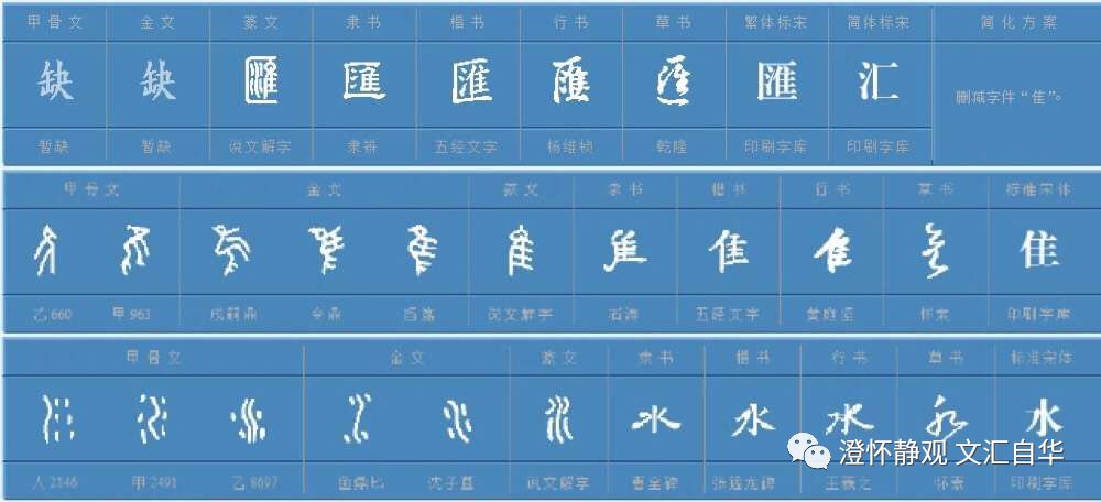 拆开这个“汇”字,分为“匚”“水”“鸟”三个部分: