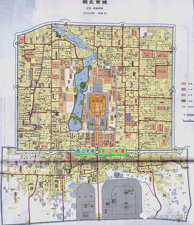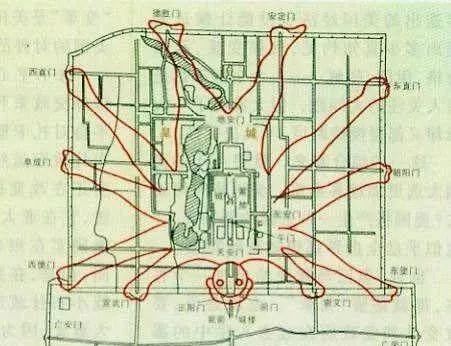 江米巷分家为东西两巷就是明永乐年间的事儿了。1401年后,姚广孝总设计师在对北京城做城市规划时,把江米巷划入到了内城。后因在正阳门和大明门(清代称大清门、民国称中华门)之间修棋盘街,故将江米巷分为了东江米巷和西江米巷两个部分。当年道衍和尚按中国儒家学说+道家风水学说为北京城布局赋魂,在东江米巷西口处设“文德”牌楼,西江米巷东口处设“武功”牌楼,文攻武略,期待保大明万世。从上面的地图可以看到,东江米巷地理位置优越,离得皇宫近,所以明朝就在这设了不少中央衙门:礼部和鸿胪寺在东江米巷的西侧以北,会同南馆(类似钓鱼台国宾馆这种招待外宾的酒店,那时候没有汽车和地铁,所以离得皇宫近最重要)就在东江米巷御河中桥西侧。这点和现在差不多,公安部、最高法院等部委机关也在此办公,最后放个两个彩蛋,一是八卦传闻北京是苦海幽州,有一只厉害的孽龙,只有八臂那吒镇得住,欲在此地建都,须得镇住孽龙。于是朱棣派大军师刘伯温和二军师姚广孝签完勘察设计,二人受到哪吒指点便设计了八臂哪吒版本的京城(这肯定不靠谱,姚广孝派去设计北京城时候,刘伯温已经离世30年,怎么能共事设计京城呢?)但是有张八臂哪吒图纸画的挺有意思,分享给大家: