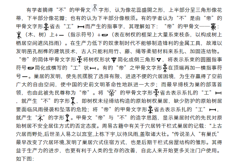 最简单的可能就是最复杂的,因为愈多限制条件就愈容易确定问题的边界从而排除干扰项,“不”字寥寥几笔的字形,让后世的有太多想象力去遐想造字初衷,从而出现了树屋说、帝本说、鸟飞说、花蕊说、草根说、瀑布说等各类思路,笔者亦暂不能有确定思路,强解之。