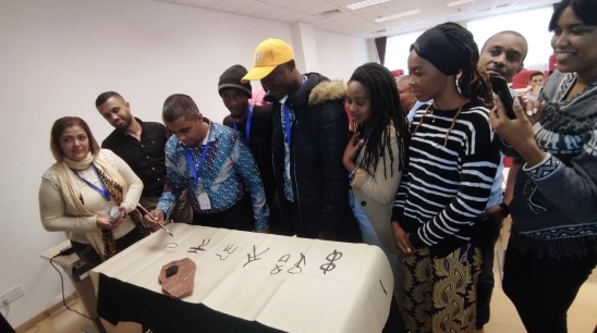 讲课中,孙老师与学员教学相长,沟通顺畅,频繁互动,讨论热烈,赢得学员的尊重。在介绍文房四宝时,孙老师向学员介绍了青州红丝砚、广饶齐笔、临朐桑皮纸等较有代表性的齐鲁文房四宝,随后邀请学员上台触摸古法造纸、感受研墨过程、体验毛笔书写,推动学员在可感环境下,较有带入性的感悟中华书写文化,最后学员每人一字写就“一带一路文旅无界”八个字作为结束。此次培训为国际友人介绍了中华优秀传统文化的发展经验,让学员感受到国学魅力,为推动中华文化自信和建立友好邦交做出了一定贡献。