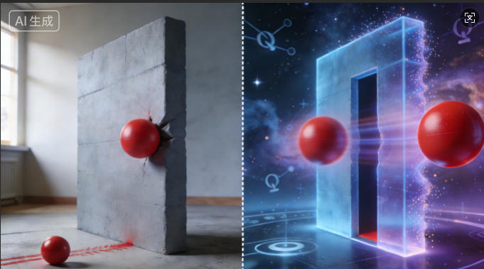 左边图是宏观世界,如果球的动能<墙壁势垒的能量,毫无疑问,球无法穿墙,这时候阻力主导。当然详细来讲,不能穿墙受到静电斥力、泡利不相容原理、凝聚态化学键刚性结构元素等制约,听起来复杂,但现实生活中,小孩子都知道,人不能穿墙,否则就得头撞南墙。