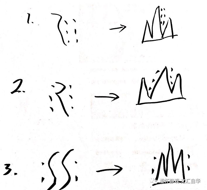 如果说存疑,那么疑问可能来自于甲骨文时期的字形,左一的容易理解,左二和左三则都是实线在中间,如果这时候实线代表石壁的话,那么为什么不写一个山字代替呢,比如下图形态: