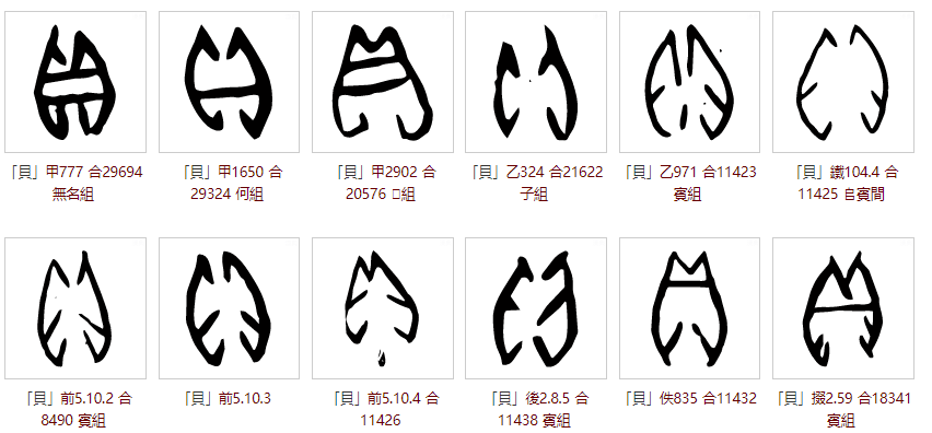 “贝”字甲骨文写法形如水生甲壳软体动物的外形,左右两瓣对称,中间咬合部有一条或两条齿状横纹。虽有诸多写法,但万变不离其宗,明显具有两瓣对称结构,如下图: