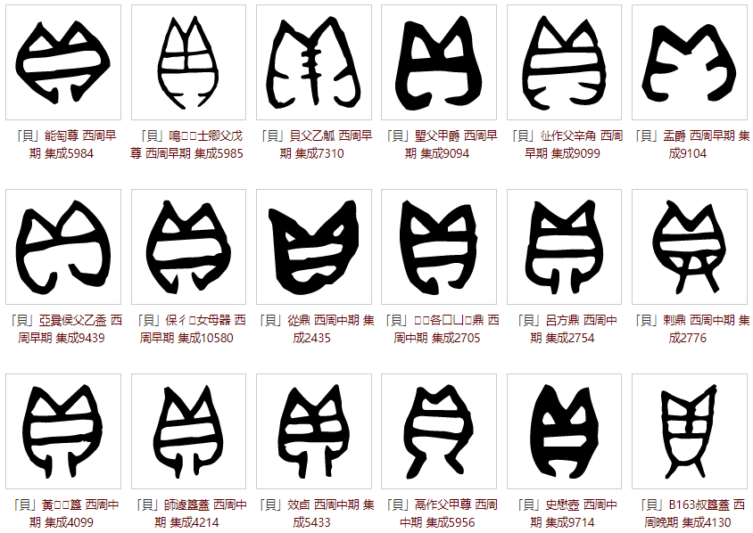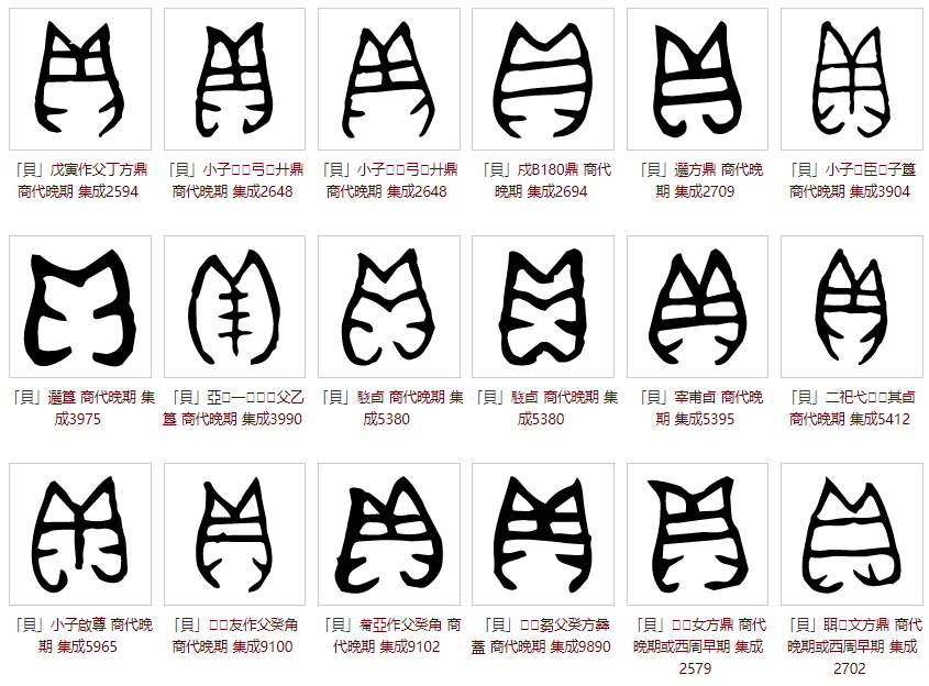 金文沿袭了甲骨文字形。但因手抄难以标准化导致有的金文突出了甲壳软体动物的对称性,有的则突出了贝壳的横纹(横纹变为三条),有的将开口的贝壳写成封闭状贝壳……慢慢有的金文将“贝”字上部衍为“目”形,象形特征大大弱化。如下图: