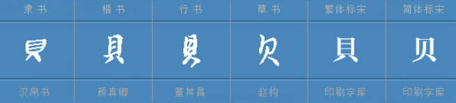 隶书开始,“贝”字下半部分简化为“八”,后简体写法取法于草书写法,逐渐成为今天的“贝”字,再难看出“貝壳”之原型。如下图: