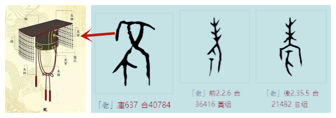 甲骨文形态的“老”最为直观,一位手持拐杖、头戴象征身份冠冕,身材佝偻的老者形象跃然纸上。至于老者头上戴的究竟为何?因史料不足,只能大胆猜想,当时的“老”字大概率专指公卿大夫类身份较高的年老官员,故他们头上应该带着的是象征身份的冠冕,因冠冕不同,所以历史上甲骨文“老”字还有多种写法,如下图(以第一幅图中冕旒式冠冕尤其形象,若能印证冕旒类在甲骨文时已出现,则此款帽子的历史将从西周大幅度提前):