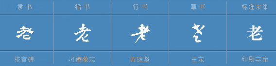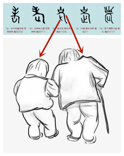 “老”字的字形流变过程中,最形象的是甲骨文时期——老年人手持拐杖;金文时期可能为了提倡“孝”道,拐杖换成了人来搀扶,而反向的人就是“匕”字的原形;篆文开始确定了下方为“匕”字的传统。正是因为不理解“匕”是反向的“人”字,才导致了对“老”字下有“匕”的诸多困顿。