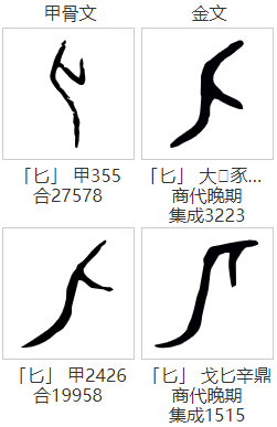 金文中最大的变化有两点,一是冠冕呈现形态多样化,这可能与商周政权更迭后意识形态变化有关,但不论如何变,均能一眼认出是顶帽子;二是“拐杖”作用形态多样化,如:反向的“人”替代了拐杖功能。若此推理成立,则体现出古人的人文关怀,因反向的“人”更利于两个人胳膊交叉,方便搀扶长者。而“匕”在《说文》中有“从反人”之解。“匕”的字形流变如下图: