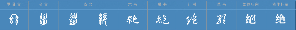 絶字像丝线不连贯的形体,是切断了两束丝线。甲骨文时期形为两缕丝线中间各加一短横,表示将丝线割成两段;金文时期更为直观的在两组丝线之间加一把刀,示意以刀断丝;篆文时期则形成了“丝+刀+人”的组合,表示人以刀断丝,絶字由三部分构成的字形基本定型。后不断演化和简化,形成今日的“绝”字。