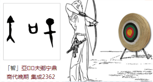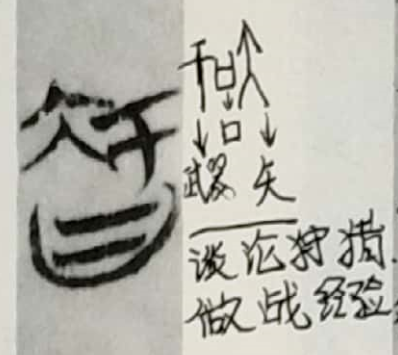 甲骨文时期形为“干+口+矢”三符号组合,意思为以“口”谈论和传授作战(或者狩猎)经验。其中“干”字存在争议,有学者解释为“盾牌”,有学者解释为“箭靶”,均可解释通顺。如“干”为盾,“矢”为箭或矛,可理解为以口传授攻防之智慧;如“干”为箭靶,矢为箭,可理解为传授如何正中靶心的智慧,因射箭时绝不能瞄准靶心射出,而需要根据风速和目标远近调整角度,这是需要技巧传授的技艺。如下图: