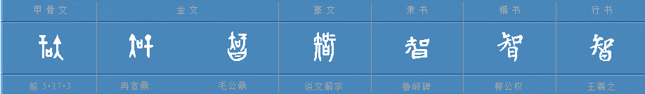 金文时期字形承袭甲骨文形态,有些金文在甲骨文形态基础上在下部添加了“曰”,“智”字就逐步替代了“知”字,代表传授经验和教授智慧。简帛时期字形基本为上下结构,沿袭金文字形的同时,对“口”字有微调。将简帛中已发现的“智”字列举如下: