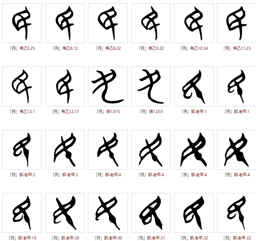 甲骨文时期形为(目,眼睛)和(十,‘又’字变体or利刃)的组合,其中“目”代表眼睛已形成共识,但下半部分具体指代什么,暂无统一定论,偏向于做“利刃”解。已发现的甲骨文形态如下: