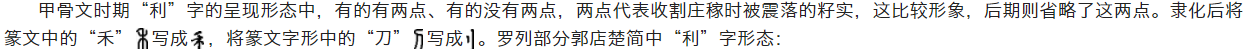 “利”字字形流变的过程中变化不大,时至今日亦是“禾”+“刂”的组合,代表以锋利之刀收割庄稼。字形流变过程: