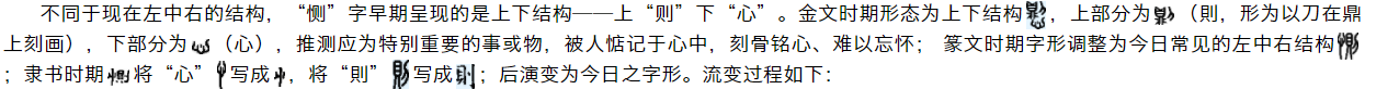 《説文解字》曰“惻,痛也。从心,则声。”学术界多将“恻”解释为“悲痛”之意,但是否只有悲痛让人刻骨铭心,难道快乐的事儿就不令人难忘?再或者,金玉满堂的宝物难道不让贪心之人心生惦记?故对“恻”字理解,暂无定论,只确定与“心”相关。