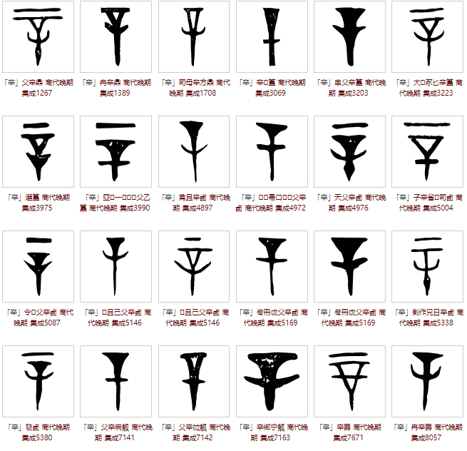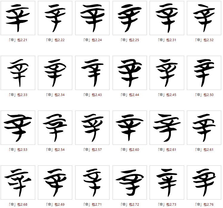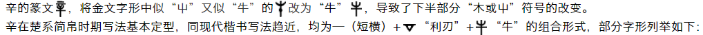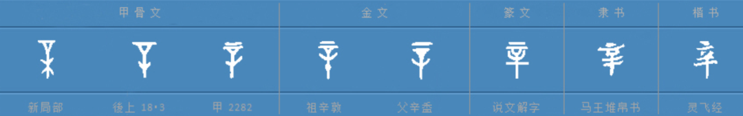 辛——字形像古代刑刀,表大罪。做名词时表大罪( 如:妻子入辛者库,财产入官);刺激性较强的植物蔬菜(大蒜勿食,荤辛害目);特指商纣王帝辛之号(如:帝辛,天下谓之纣);天干第八位;姓。做形容词时表辛辣的、辛凉的;劳苦、辛苦(如东君用意不辞辛,料想春光先到处,吹绽梅英);悲伤劳苦的,酸痛。《说文》曰:“辛,大罪也”。字形流变如下: