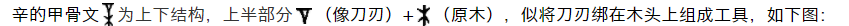僕的甲骨文(辛)+(尾巴)+(双手持)+(装垃圾的箕)四部分组成,构造较复杂,不免觉得繁而不解,心生困顿。此时不若放下烦扰,换个思路,可能通过解决一系列难题,将复杂问题各个击破,化繁为简。故欲解“僕”字,将先从“辛”、“尾”等组成部分入手,待局部攻破,再尝试整合起来系统分析“僕”字。