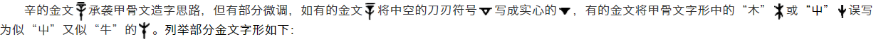 辛的甲骨文在学术界有多种解释,有学者解读为“用利刃劈砍木材”,但有个漏洞,即若为以利刃向下砍木材,那刃面应向下对准木材才符合逻辑,的方向应向下,而非向上;有学者解读为“锥子,大头呈三角形,中间有把手,小者用作刑具,大者用以劈木”,该解释讲得通;还有学者认为“天然而生的尖锐物体,皂荚之大刺、麦芒。古人受到天然尖锐物体的启发,发明类似工具。甲骨文画一个倒刺、上添一横表天然”,也讲得通。列举皂荚刺和辛字字形对比图:
