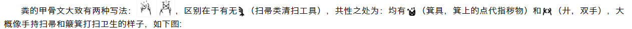 从出土情况看,粪的甲骨文写法大致可分上面两类,但具体写法相对多元,列举部分甲骨文字形如下: