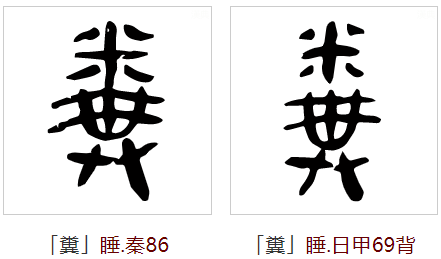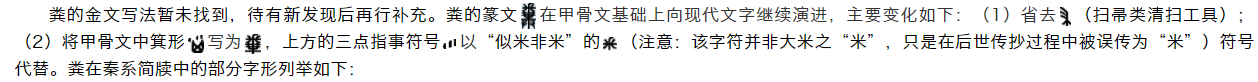 《说文解字》曰:“糞,棄除也。从廾推糞釆也。官溥說:似米而非米者矢字”;意为:粪,清除粪便垃圾。字形采用“廾、”会义,表示手推箕具除屎。官溥说:似“米”而非“米”字形,表达“屎”字。字形流变过程:
