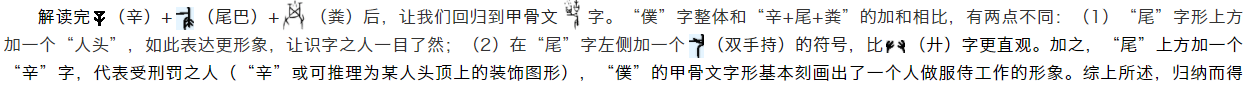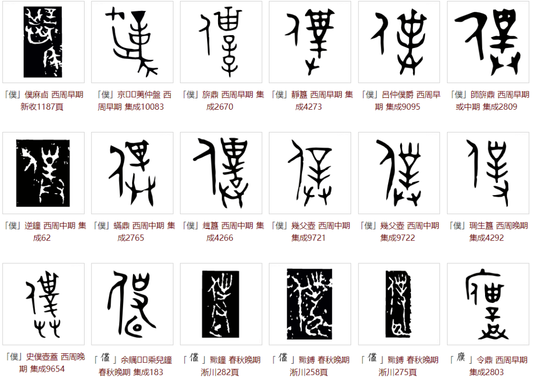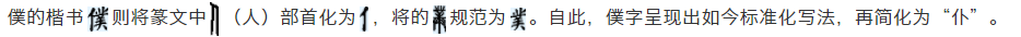 《说文解字》曰:僕,給事者。从人,从菐,菐亦聲。意为:僕,供役使的人,字形采用“人、菐”会义,“菐”也是声旁。字形流变过程: