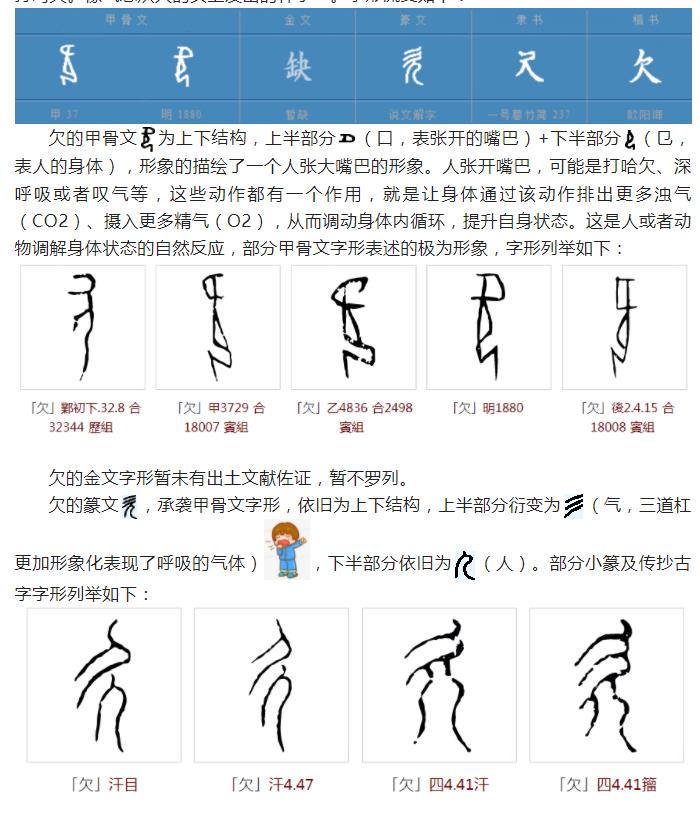 《说文解字》曰:“欠,张口气悟也。象气从人上出之形”,意思即“ 欠,像人张口打呵欠。像气息从人的头上发出的样子”。字形流变如下: