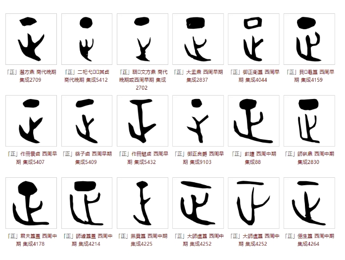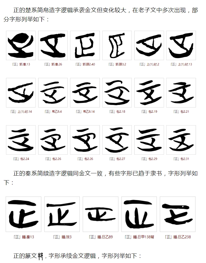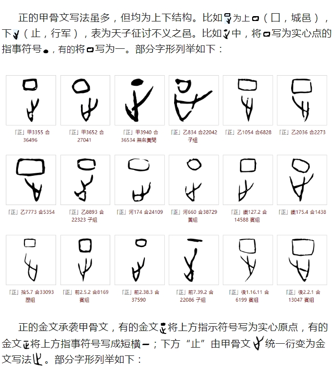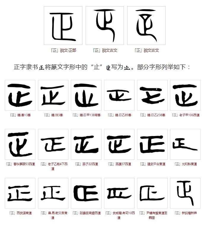 《说文解字》曰:正,是也。从止,一以止。凡正之屬皆从正。㱏,古文正。从二;二,古上字。,古文正。从一、足;足亦止也。意为:正,使恰当。字形采用“止”作字根,指事符号“一”表征讨或正冲而去。所有与正相关的字,都采用“正”作边旁。㱏,这是古文写法,采用“二+止”会义,二表示上苍。,也是古文写法, 采用“一+足”会义,足为“止”。