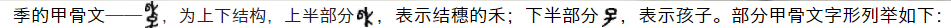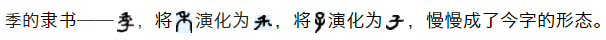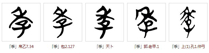 季的篆文——承续甲骨文、金文字形。《说文解字》曰:“季,少称也”,表示对同辈中年纪最轻者的称呼。部分简帛字形列举如下: