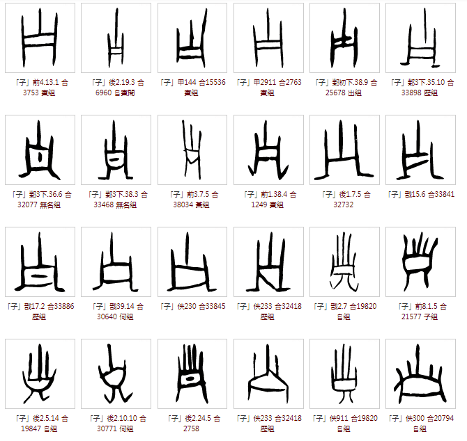 子的金文基本承续甲骨文字形,虽变体繁多,但基本均保留了“脑袋+胳膊+躯干身体”的结构,列举部分如下: