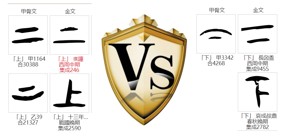 指事造字法属于独体造字法,许慎将其排名第一,并非代表其比象形造字要早,只是许慎的一种排名而已。该造字法包含着抽象思维的萌芽,体现出了古代先辈的造字智慧。比如许慎说的“上下”二字,就是以长横线为基础参照物,引入“短横线”作为指示,短横线在上则为上,在下则为下: