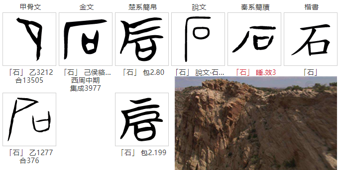 这类参照实物面貌高度还原的造字法,优点是特别容易让更广泛的受众认识该字,较易传播和传承,所以甲骨文时期大部分字都是象形字,而且几乎所有的古文明造字法都是以象形字为主。可以说象形文字是指事、会意、形声、转注、假借等造字方法的基础,推论人类文明史上第一个字大概率是象形字。当然象形也有相对复杂的组成形式——合体象形,其需要两个象形符号共同组成某个形状才能表达出该字的涵义,比如石头的“石”字,其中"厂"(han四声)代表山或丘陵类地域特色;"口"代表石块的形状。这两个部分组合才让人们对石头的石有了相对清晰的概念。这说明合体象形的产生是由于区别象形形体的需要,即加上一个表示同类事物的字,使所摹写的对象能更容易快速确定。