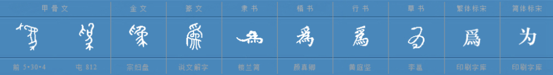 为的篆体  ,大象形态已抽象到难以直观辨认。为的楷书 。为的简体字大概率是承袭了草书形态而来。