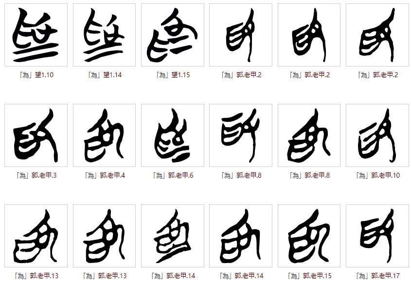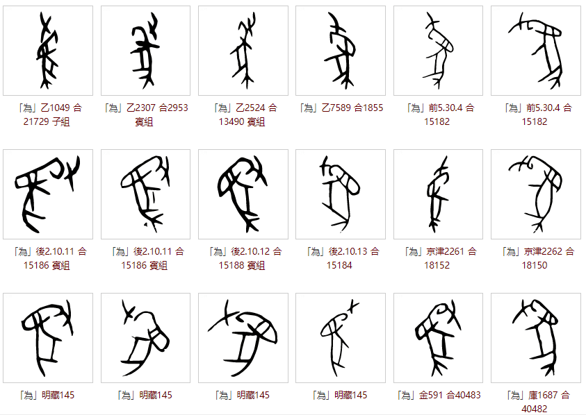 爲的甲骨文——为左右结构,左边表以手牵之+右边大象,可能表示人驯化大象,大象是当时人类日常能接触到的体型最大的动物,比牛马更为高大有力,如果有人能让大象为人类所用,那无疑代表了人类能动力的顶峰。部分甲骨文字形列举如下: